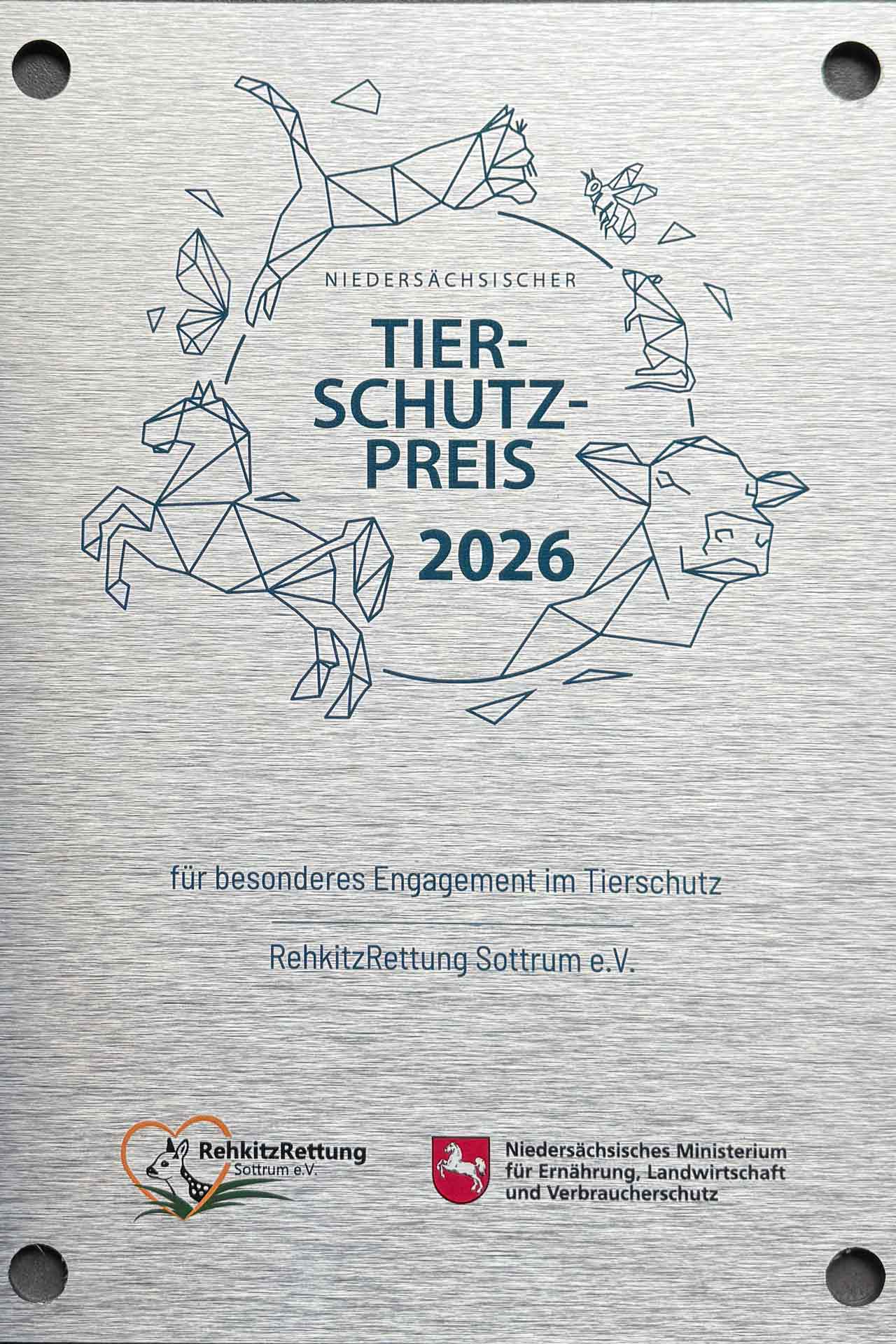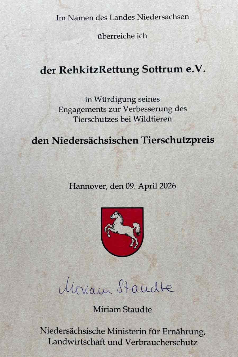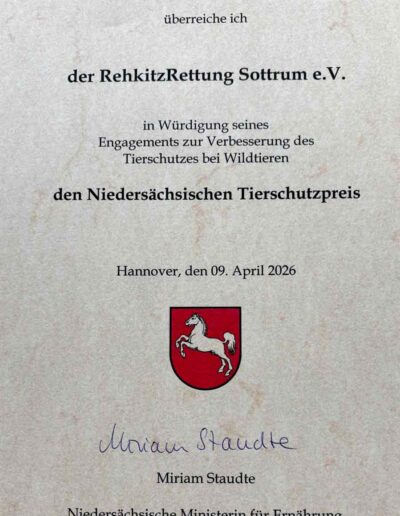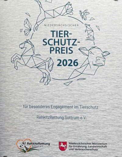 Der Tierschutzpreis 2026 zeichnet einen besonderen Einsatz zur Verbesserung des Tierschutzes bei Wildtieren aus und ist mit 30.000 Euro dotiert. Sechs Organisationen wurden am 9.04.2026 in Hannover mit diesem Preis ausgezeichnet, unter anderem die RehkitzRettung Sottrum!